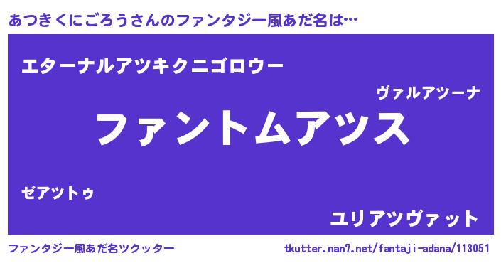 | 男性向けラノベタイトル風あだ名 | 『ダンジョンにあつきくにごろうを求めるのは間違っているだろうか』 |