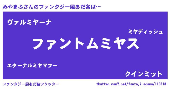 | 女子向けラノベタイトル風あだ名 | 『みやまふの卵を拾いまして』 |