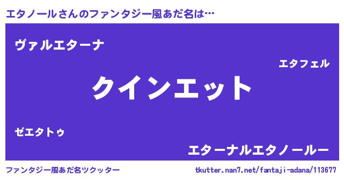 | 男性向けラノベタイトル風あだ名 | 『おまえをオタクにしてやるから、俺をエタノールにしてくれ! 』 |