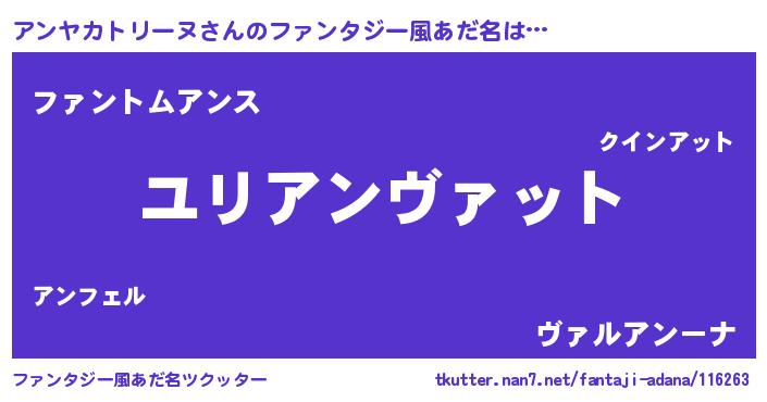 | 男性向けラノベタイトル風あだ名 | 『アンヤカトリーヌ~年齢イコール彼女いない歴の魔法使い~』 |