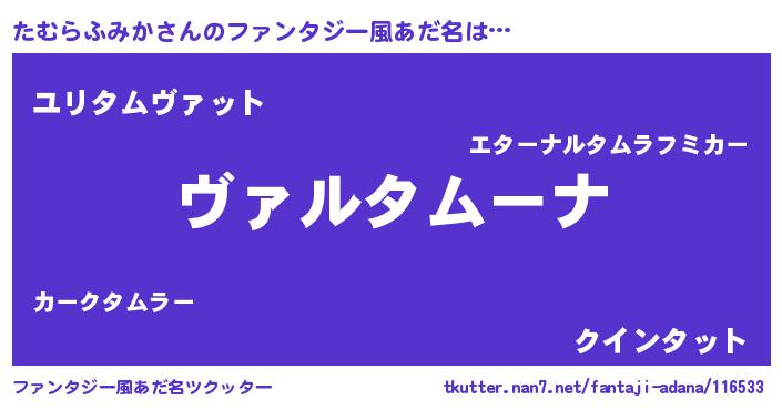 | 男性向けラノベタイトル風あだ名 | 『魔弾の王とたむらふみか』 |