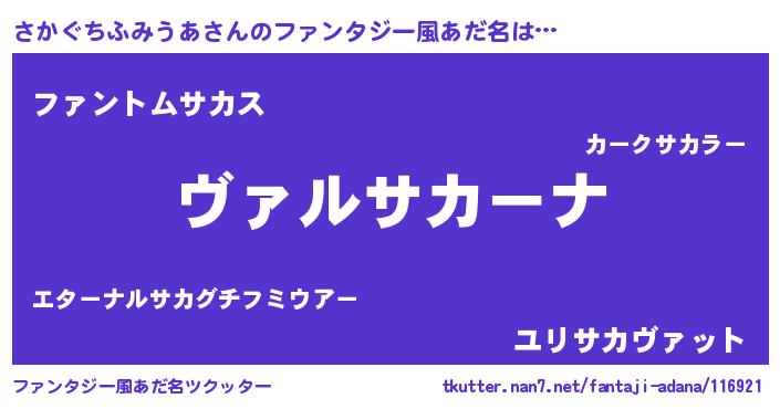 | 男性向けラノベタイトル風あだ名 | 『この素晴らしい世界にさかぐちふみうあを!』 |