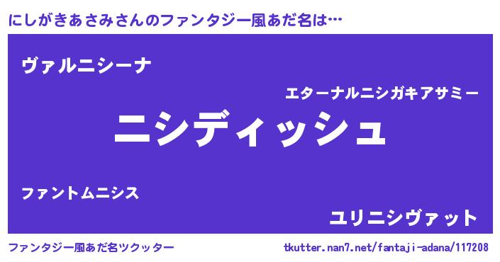 | 男性向けラノベタイトル風あだ名 | 『にしがきあさみという概念が存在しない退屈な世界 』 |