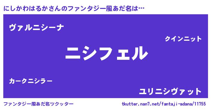 | 男性向けラノベタイトル風あだ名 | 『ニシカワハルカアートオンライン』 |
