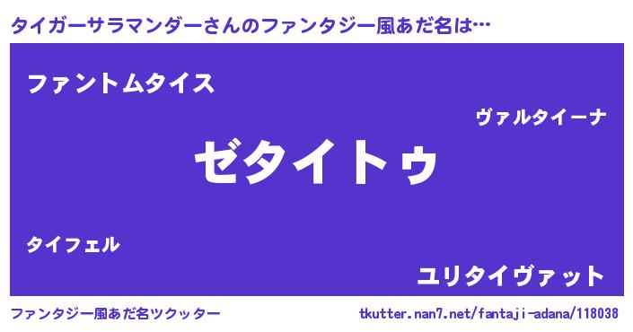 | 男性向けラノベタイトル風あだ名 | 『Re:タイガーサラマンダーから始める異世界生活』 |
