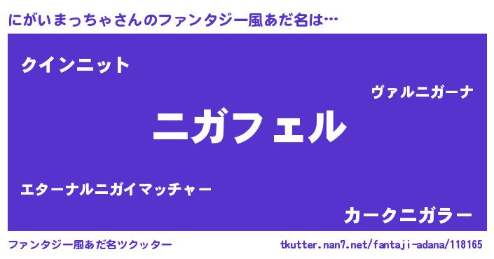 | 男性向けラノベタイトル風あだ名 | 『にがいまっちゃの憂鬱』 |