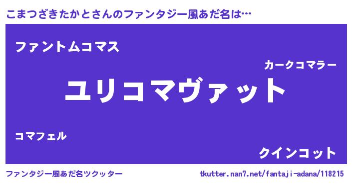| 男性向けラノベタイトル風あだ名 | 『こまつざきたかと~年齢イコール彼女いない歴の魔法使い~』 |