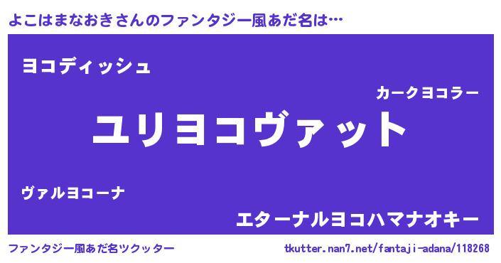 | 男性向けラノベタイトル風あだ名 | 『よこはまなおき~年齢イコール彼女いない歴の魔法使い~』 |