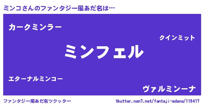 | 男性向けラノベタイトル風あだ名 | 『ミンコの憂鬱』『魔弾の王とミンコ』 |