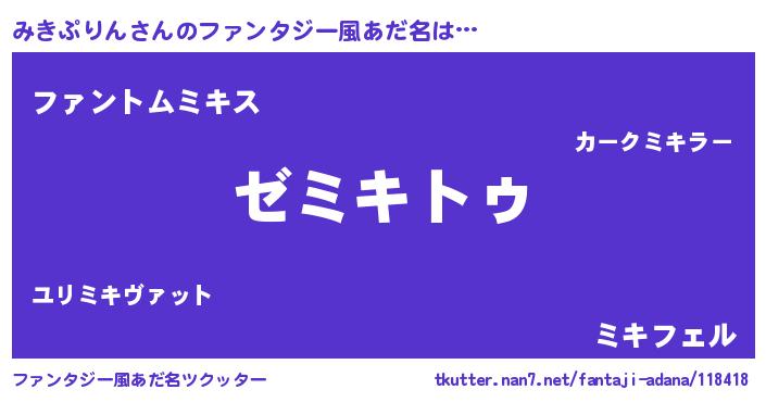 | 男性向けラノベタイトル風あだ名 | 『Re:みきぷりんから始める異世界生活』 |