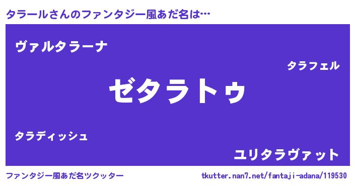 | 女子向けラノベタイトル風あだ名 | 『タラールなんてお断りですっ。』 |