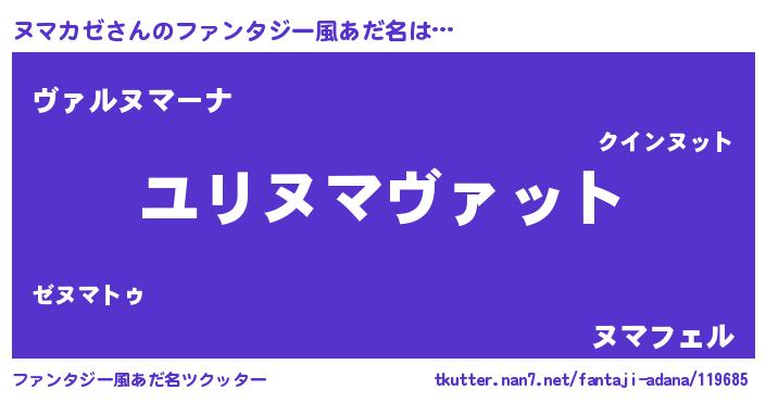 | 男性向けラノベタイトル風あだ名 | 『ヌマカゼスレイヤー』 |