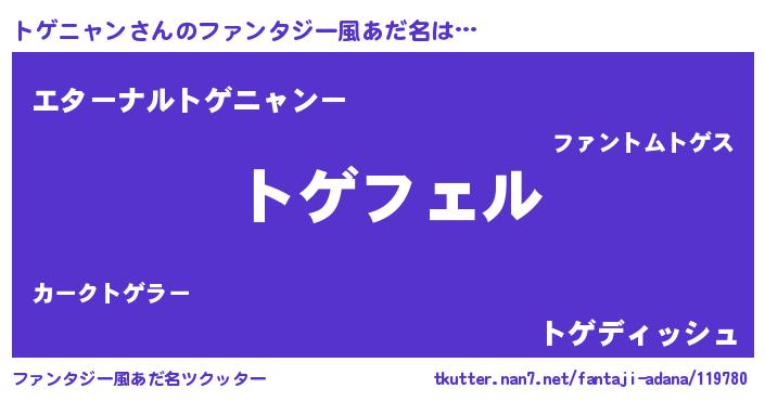 | 女子向けラノベタイトル風あだ名 | 『(仮)トゲニャンのやんごとなき事情』 |