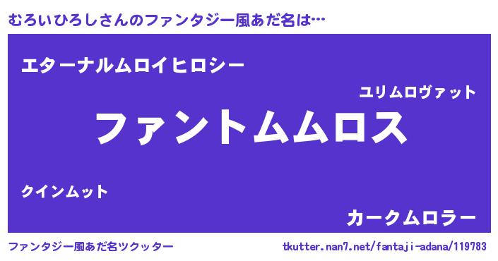 | 男性向けラノベタイトル風あだ名 | 『むろいひろしの嫁は女の子じゃないと思った?』 |