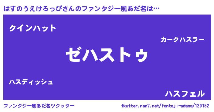 | 男性向けラノベタイトル風あだ名 | 『Re:はすのうえけろっぴから始める異世界生活』 |