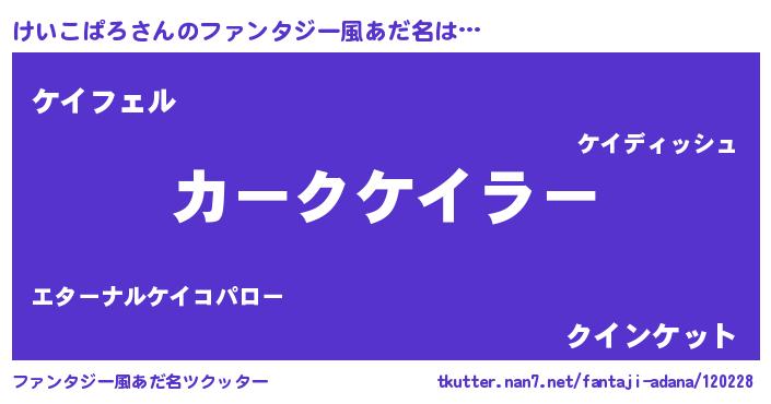 | 男性向けラノベタイトル風あだ名 | 『うちのけいこぱろが世界を掌握している!』 |