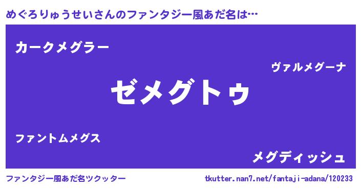 | ヘコむあだ名 | 『めぐろりゅうせい(震え声)』『めぐ太郎』 |