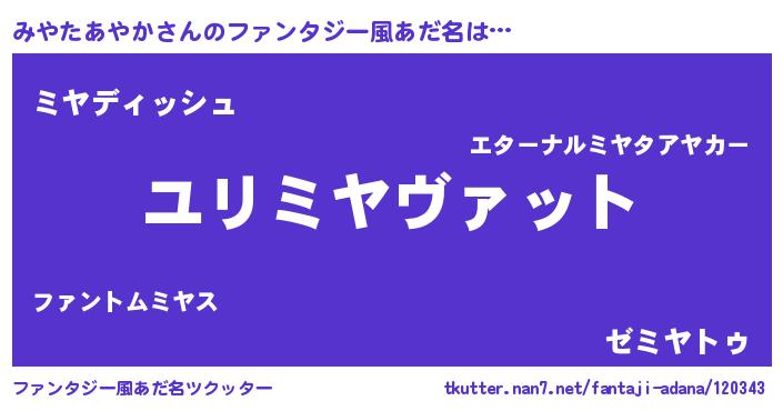 | 男性向けラノベタイトル風あだ名 | 『転生したらみやたあやかだった件』 |