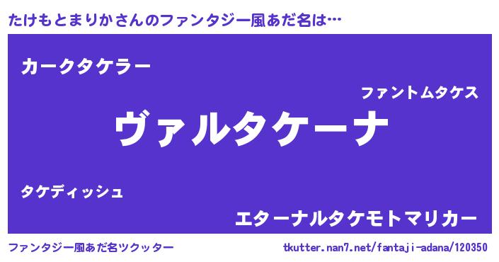 | 男性向けラノベタイトル風あだ名 | 『魔弾の王とたけもとまりか』 |