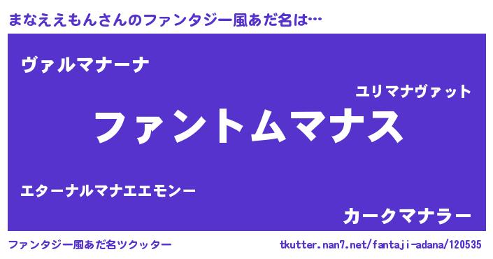 | 女子向けラノベタイトル風あだ名 | 『まなええもんは平凡を望む』 |