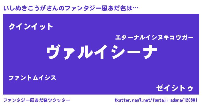 | 男性向けラノベタイトル風あだ名 | 『魔弾の王といしぬきこうが』 |