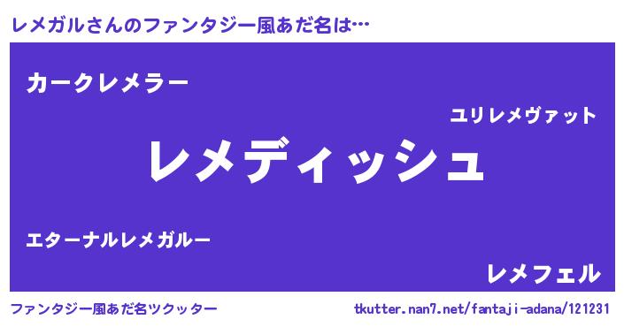 | ポケモン風あだ名 | 『レメゴンZ』『ゼニレメ』 |