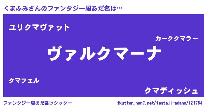 | 男性向けラノベタイトル風あだ名 | 『魔弾の王とくまふみ』『くまふみの憂鬱』 |