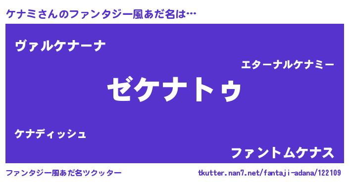 | 男性向けラノベタイトル風あだ名 | 『Re:ケナミから始める異世界生活』 |