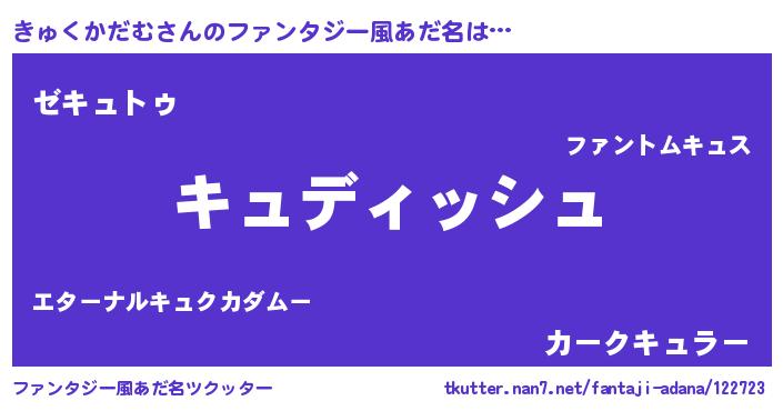 | 男性向けラノベタイトル風あだ名 | 『きゅくかだむという概念が存在しない退屈な世界 』 |