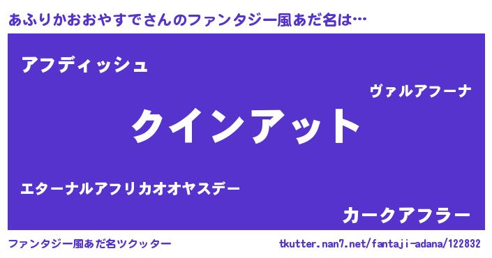 | 女子向けラノベタイトル風あだ名 | 『死神あふりかおおやすでの再婚』 |