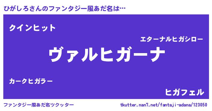 | 男性向けラノベタイトル風あだ名 | 『魔弾の王とひがしろ』 |