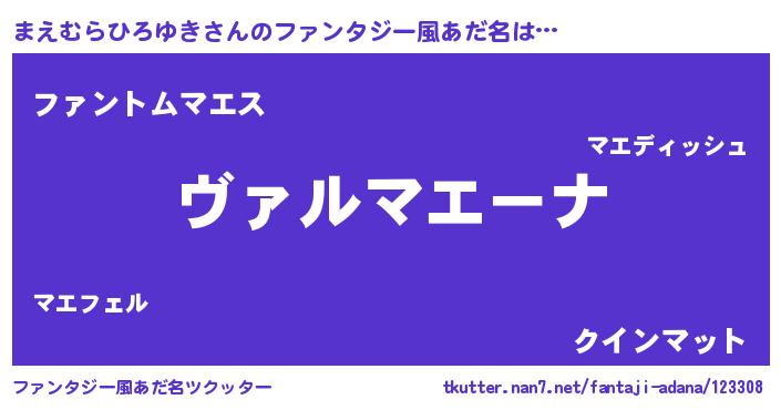 | 男性向けラノベタイトル風あだ名 | 『魔弾の王とまえむらひろゆき』 |