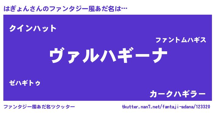 | 男性向けラノベタイトル風あだ名 | 『魔弾の王とはぎょん』 |