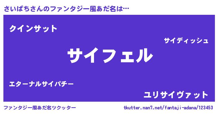| 男性向けラノベタイトル風あだ名 | 『さいぱちの憂鬱』 |