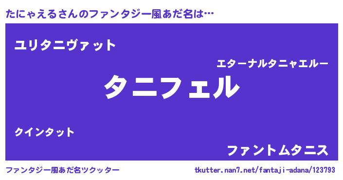 | 男性向けラノベタイトル風あだ名 | 『タニャエルアートオンライン』 |