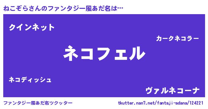 | 男性向けラノベタイトル風あだ名 | 『ネコゾラアートオンライン』 |