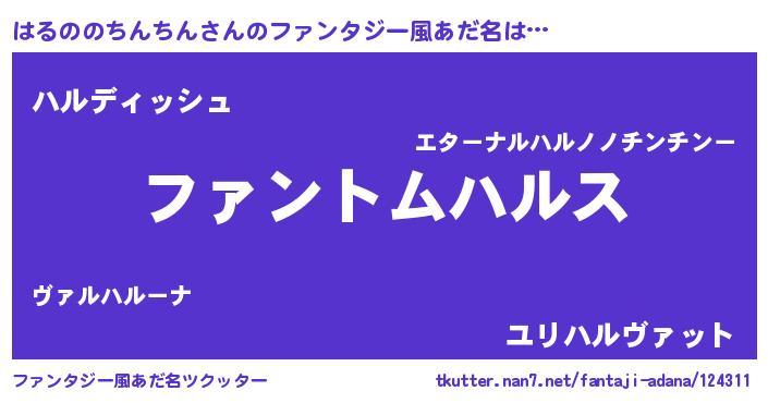 | 女子向けラノベタイトル風あだ名 | 『はるののちんちんの卵を拾いまして』 |