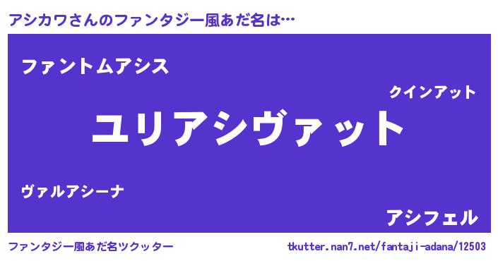 | 男性向けラノベタイトル風あだ名 | 『アシカワ~年齢イコール彼女いない歴の魔法使い~』 |