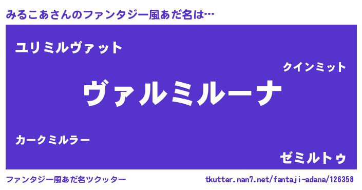 | 女子向けラノベタイトル風あだ名 | 『みるこあが死なない童話 林檎のみるこあの診療簿』 |
