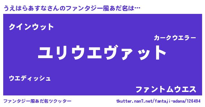 | 男性向けラノベタイトル風あだ名 | 『転生したらうえはらあすなだった件』 |