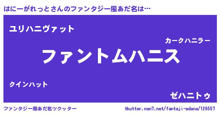 | 男性向けラノベタイトル風あだ名 | 『はにーがれっとの嫁は女の子じゃないと思った?』 |