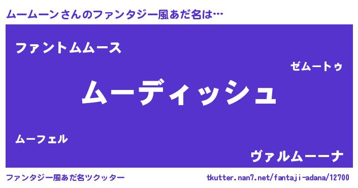 | 男性向けラノベタイトル風あだ名 | 『ムームーンという概念が存在しない退屈な世界 』 |