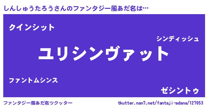 | 男性向けラノベタイトル風あだ名 | 『しんしゅうたろう~年齢イコール彼女いない歴の魔法使い~』 |