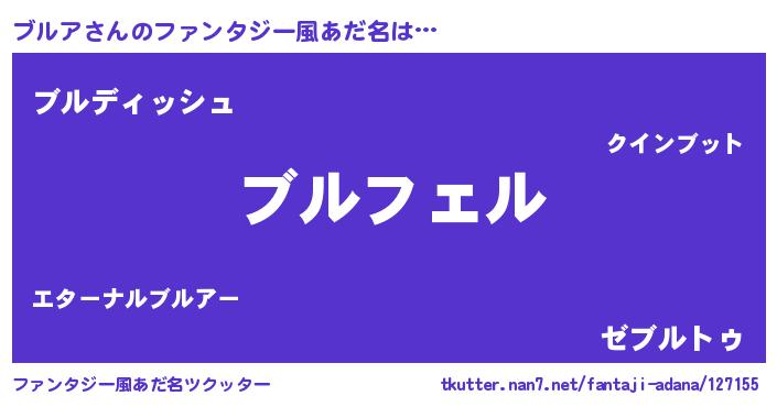 | 男性向けラノベタイトル風あだ名 | 『ブルアの憂鬱』『魔法科高校のブルア』 |