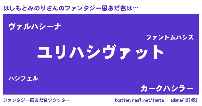 | 男性向けラノベタイトル風あだ名 | 『はしもとみのり~年齢イコール彼女いない歴の魔法使い~』 |