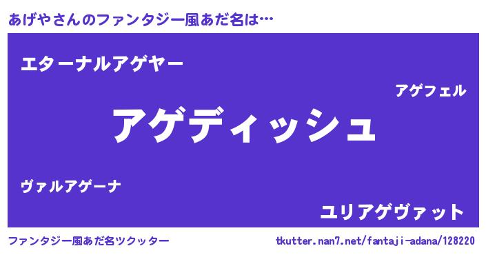 | 男性向けラノベタイトル風あだ名 | 『あげやという概念が存在しない退屈な世界 』 |