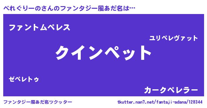 | 男性向けラノベタイトル風あだ名 | 『おまえをオタクにしてやるから、俺をぺれぐりーのにしてくれ! 』 |