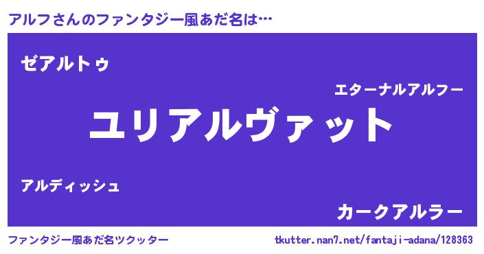 | 男性向けラノベタイトル風あだ名 | 『アルフ~年齢イコール彼女いない歴の魔法使い~』 |