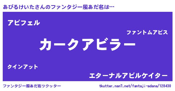| 男性向けラノベタイトル風あだ名 | 『うちのあびるけいたが世界を掌握している!』 |