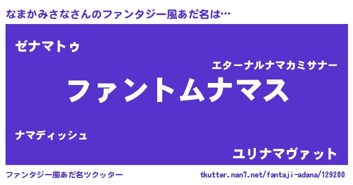 | 男性向けラノベタイトル風あだ名 | 『なまかみさなの嫁は女の子じゃないと思った?』 |